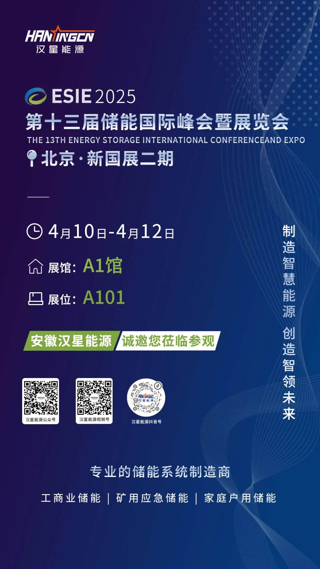 The 13th Energy Storage International Summit and Exhibition (2025 ESIE) will be held at the Capital International Convention and Exhibition Center (New China International Exhibition Center Phase II) from April 10 to 12, 2025. With the theme of "Digital Intelligence Empowers Industrial Transformation, Energy Storage Reshapes the Energy Landscape", this summit is expected to attract more than 500 world-renowned companies to participate in the exhibition, focusing on displaying the innovative achievements of the entire industry chain such as energy storage batteries, system integration, and testing equipment, and presenting the strength of the entire energy storage industry chain in all aspects. As a professional energy storage system manufacturer , Hanxing Energy will bring its star products to this summit!