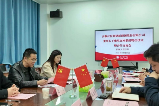 On the afternoon of November 28, Wang Yaqi, President of Hanxing Smart Energy, was appointed as a visiting professor at Chaohu University. The appointment ceremony was held grandly at Chaohu University.Ding Junmiao, Member of the Party Committee and Vice President of Chaohu University, and Zhang Wei, Deputy Secretary-General of the Anhui New Energy Storage Industry Innovation Alliance, attended the ceremony alongside corporate leaders such as Wang Yaqi, President of Hanxing Smart Energy, and Fan Fei, Assistant President, among others.