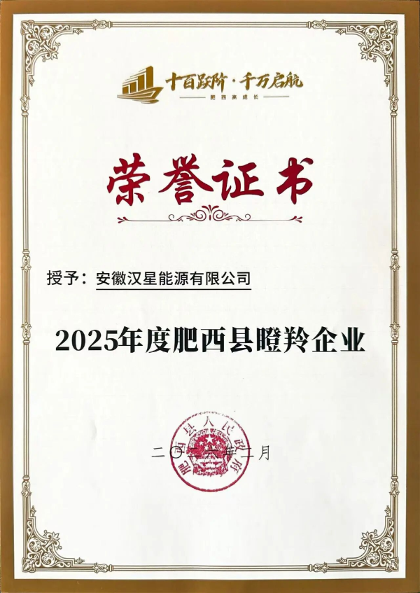 Recently, the list of 2025 "Gazella Company" in Feixi County was officially announced. Hanxing Energy, with its strong development momentum and continuous innovation ability, successfully won the honorary title of "Gazella Company" in Feixi County for 2025. This honor not only recognizes the company's growth rate but also signifies that Hanxing Energy has officially entered the core track of Feixi County's high-growth enterprise gradient cultivation system.